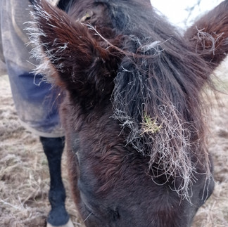 Twas a pretty chilly day this morning when I woke up. Out of the window all I could see was fog. The temperature had dropped low enough to make an amazing hoar frost, very pretty but very cold. The horses had frosty ear hair and whiskers, which makes tham look like they have all aged over night. The muddy part of the track down to the field was masquerading as solid until I put my foot on it and sank down 8 inches and across 6. Luckily im used to this mud skating, wading and leaping routine and I can negotiate the path fairly uneventfully most days. This was not one of those days and a misjudged step took me down another 4inches to almost top of welly height. I live to see another day.